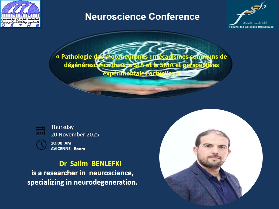 EVENEMENTS Neuroscience Conference RADIO-USTHB Infoday Conférence START-UP (12 Novembre 2025) The sceond scientific day of the LBCM-Tamayouz. Les 10èmes Journées scientifiques du LBPO (FSB / USTHB) Project LABEL “SafePharm”